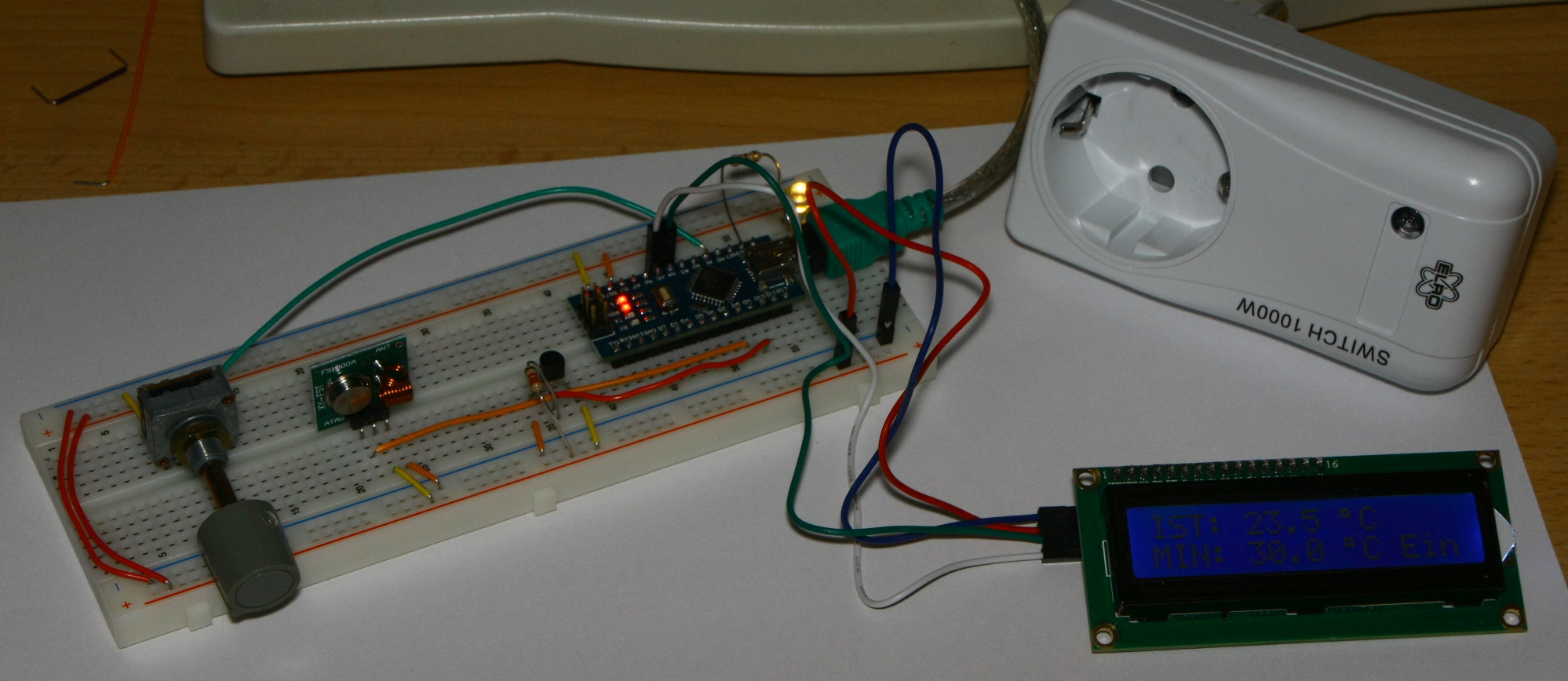 Kernkomponenten sind ein Arduino Uno oder Nano, ein digitaler Termperatursensor (DS1820), ein 433MHz Funksender und eine Funksteckdose.