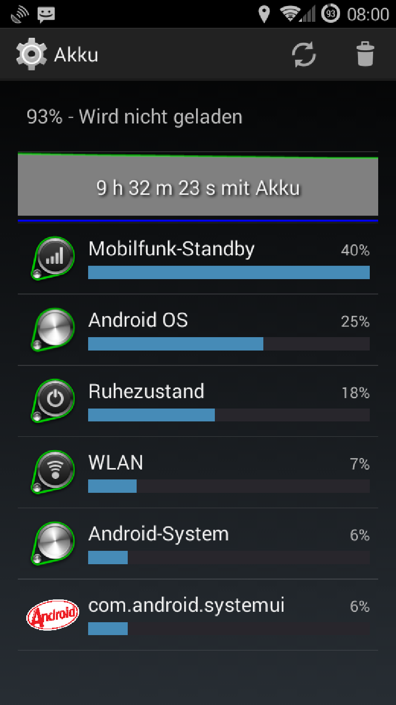 Da heute Feiertag ist, liegt das Telefon die meiste Zeit herum. Konkret zeigt BetterBatteryStats nach 4h herumliegen sagenhafte 1% Akku-Verbrauch pro Stunde an, also 4 Tage Akku-Laufzeit im Standby. Das Telefon verbringt 90% seiner Zeit im Deep-Standby und wird bisher durch keine App daran gehindert.