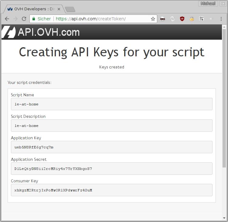 Um auf die OVH-API zugreifen zu können, müssen zunächst ein Consumer-Key, ein Application-Key sowie ein Application-Secret erzeugt werden. Dazu gibt es verschiedene Varianten. Die einfachste Möglichkeit ist das Web-Tool von OVH: https://api.ovh.com/createToken/.