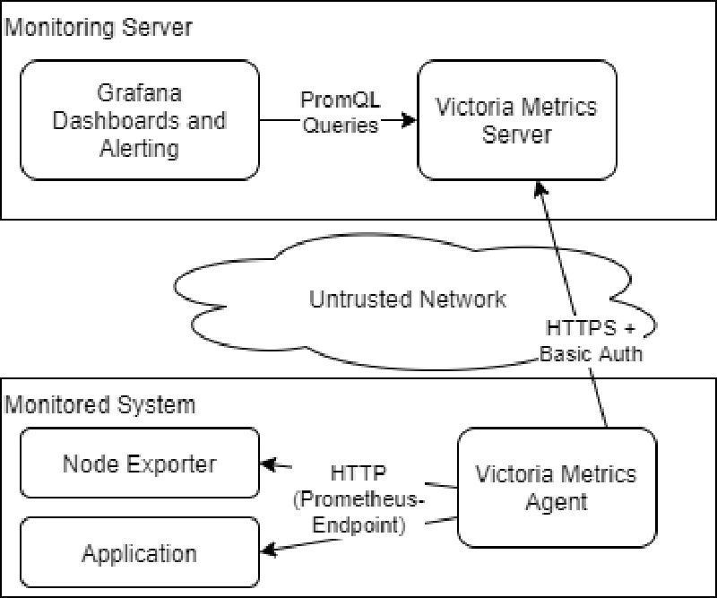 A while ago I was looking around for an agent that collects and sends metrics to a centralized Prometheus instance. I stumbled across Victoria Metrics which has exactly the agent I was looking for - and many more in addition. So I decided to base my new monitoring solution on it.