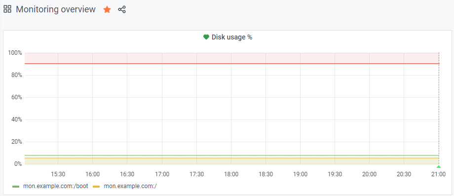 This will print the used disk space in percent for each device on each monitored node. In the „legend" field, the labeling can be customized. A good start would be „{{container_id}}:{{ mountpoint }}". The disk space will probably not change a lot within very short times, so the resolution can be set to 1/10.